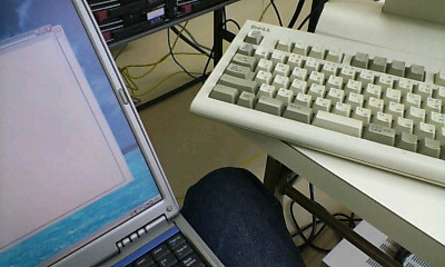 机にサーバにつながるキーボードをたたく…。